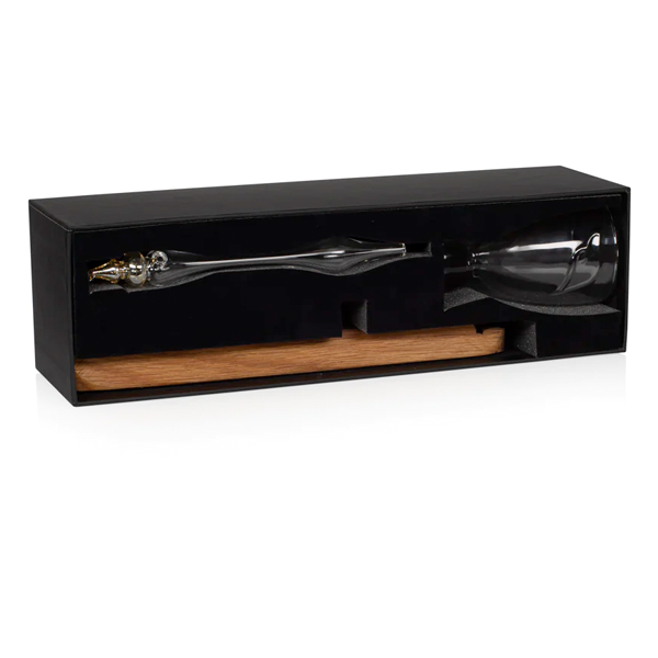 Tom fand es selbst immer wieder erstaunlich, welchen Effekt ein paar Tropfen Wasser im Whisky hervorrufen. Die gängigen Pipetten fand er jedoch nicht schick genug. Deshalb entwickelte er den einzigartigen Whisky Dropper Pot Still. Diese Pipette ist etwa 20 cm lang und vollständig von Hand gefertigt. Am Ende befindet sich ein Pot Still, also der berühmte Kessel, in dem Whisky gebrannt wird. Zum Set gehören auch Hinweise dazu, wie man die Glaspipette einsetzt, um dem Whisky ein paar Tropfen Wasser hinzuzufügen. Die Pipette ist ein Stück größer als die Glencairn Whiskypipette. Dank des Tasting Sets lässt sich die Pipette jedoch auf schöne und praktische Weise unterbringen.